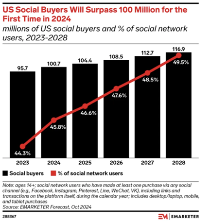 According to market research firm eMarketer, U.S. social commerce sales are expected to reach $71.6 billion in 2024, marking a 26% year-over-year increase. The number of social buyers in the U.S. will also surge past 100 million, with annual growth projected to remain around 40% in the coming years.
