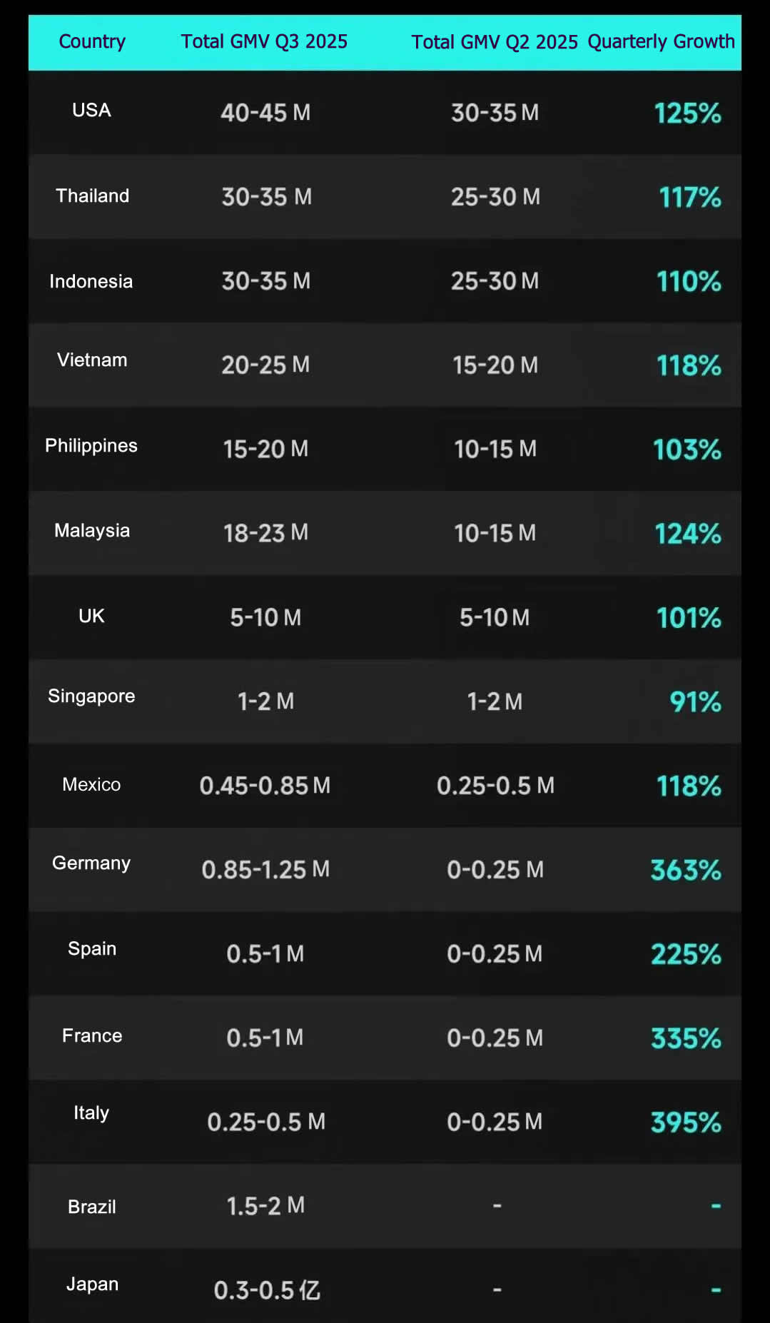 By region, the United States remains the top contributor to total revenue, ranking first in GMV with an estimated $4–4.5 billion, roughly double compared to the previous quarter. Following closely are several popular Southeast Asian markets — Thailand, Indonesia, Vietnam, the Philippines, and Malaysia — each generating several billion dollars in GMV with quarter-over-quarter growth exceeding 100%.